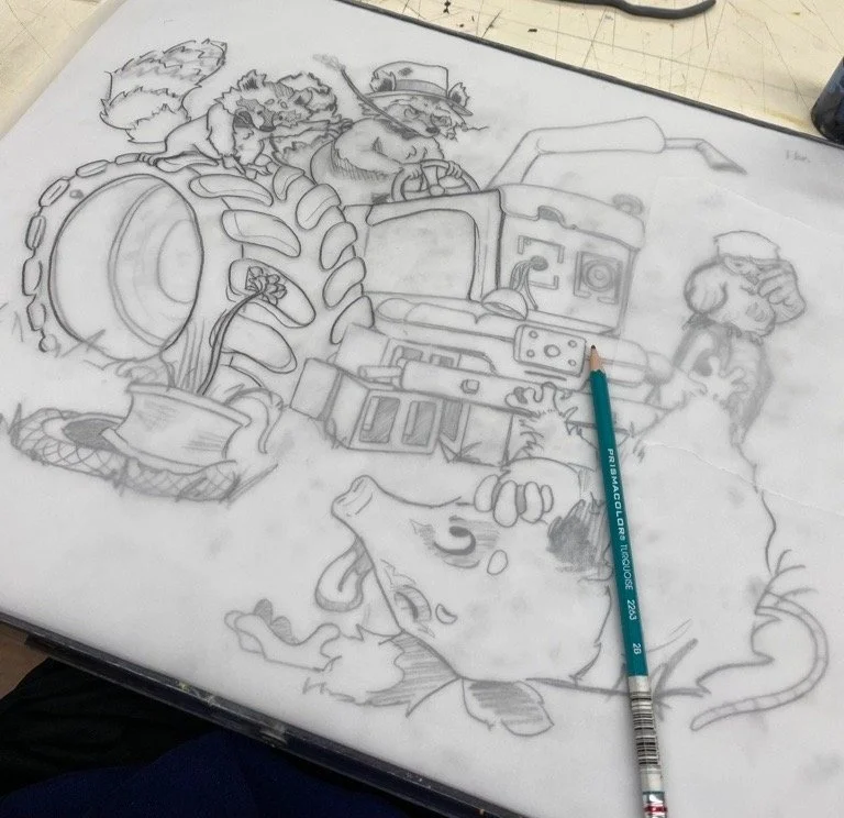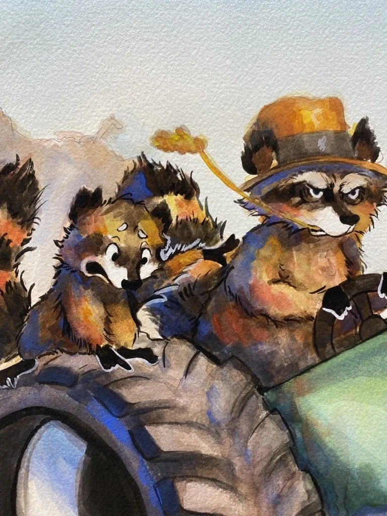 The junkyard is the best place for dramatic moments, such as Mr. Possum’s attempt to play roadkill after Papa Racoon “drives” his beat-up tractor. This piece was created to convey emotions through a non-figurative subject. The challenge was posing the characters and tractor in an intriguing angle with a good point of view. This piece went through almost 30 redraws to get the angle correct.